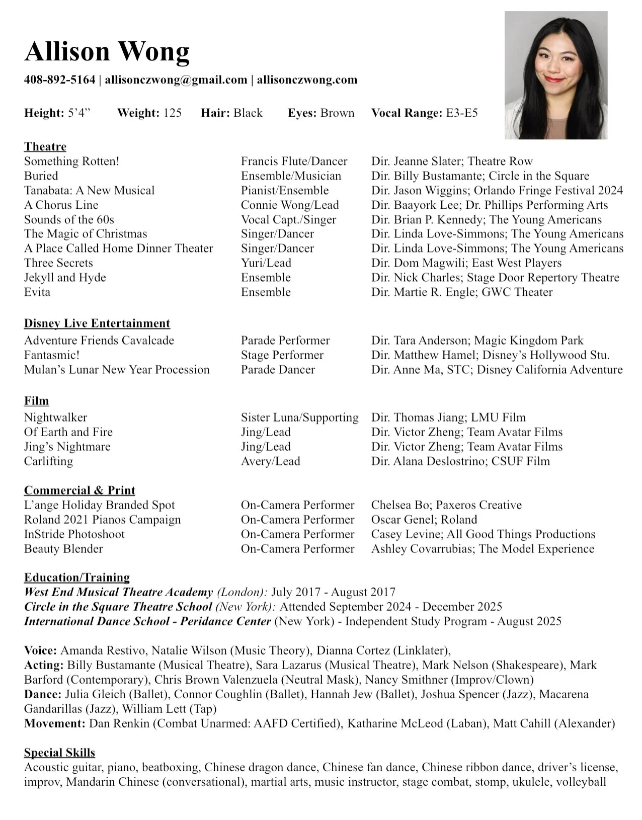 Allison Wong is a New York-based performer originally from Cupertino, California. Her work has spanned from shows & parades at Disney Parks to Broadway-style dinner theatre productions in Northern Michigan, Arkansas, and Los Angeles with song & dance company The Young Americans.